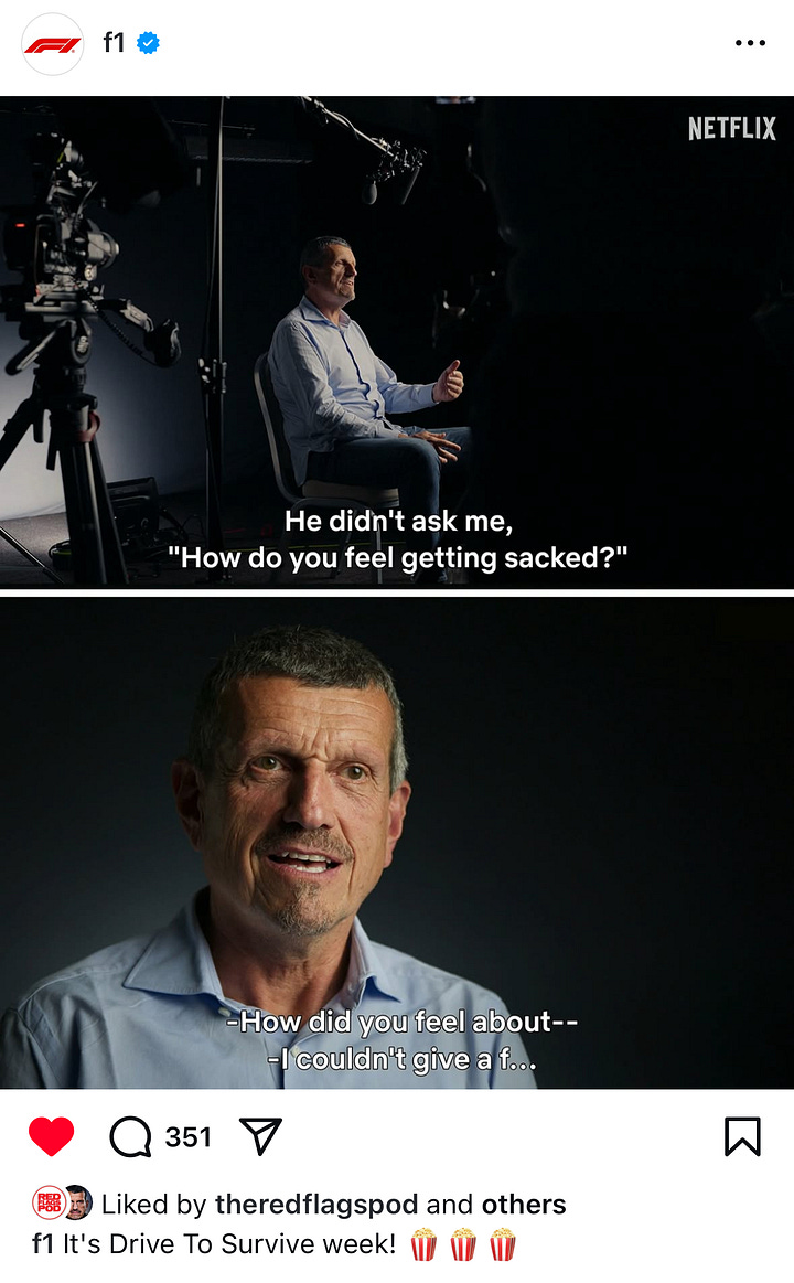 We can officially ALMOST say “ITS RACE WEEK”. But I can say Happy Drive to Survive Release week!!!! I’m in the middle of listening to Guenther Steiner’s book and I love listening to him on Red Flag Podcast, which makes that cameo in the DTS trailer so enjoyable. What you can expect from me this season is pretty simple: